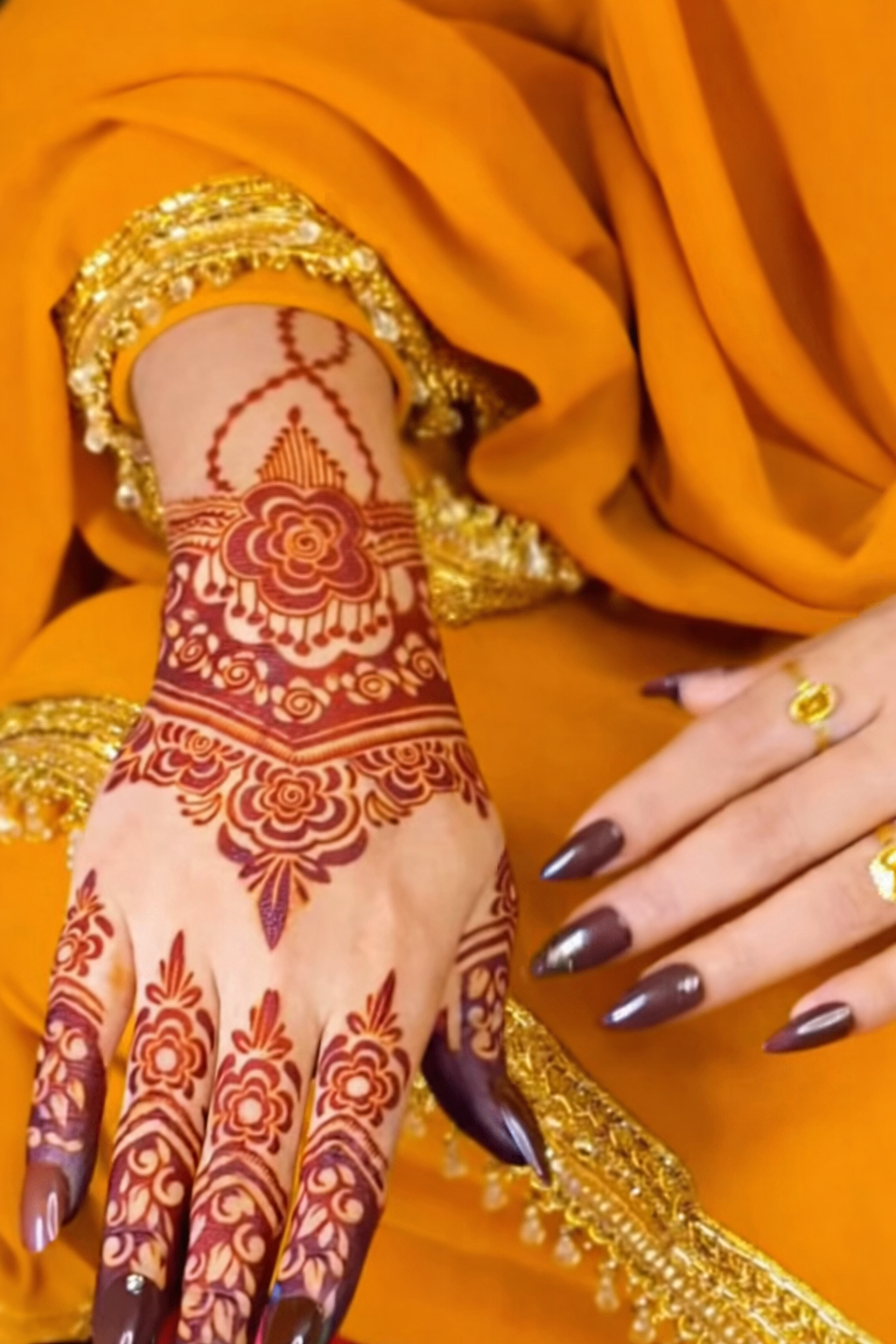 The design balances bold floral elements with clean linework, offering a rich yet uncluttered appearance. Finger detailing is kept elegant with symmetrical motifs and soft fills, making the design ideal for those who prefer a classy, refined mehendi look rather than heavy coverage.
