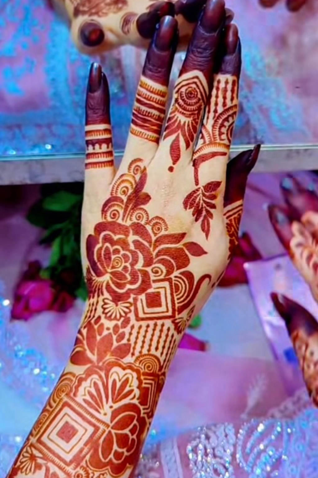 • Floral and geometric full-arm mehendi design